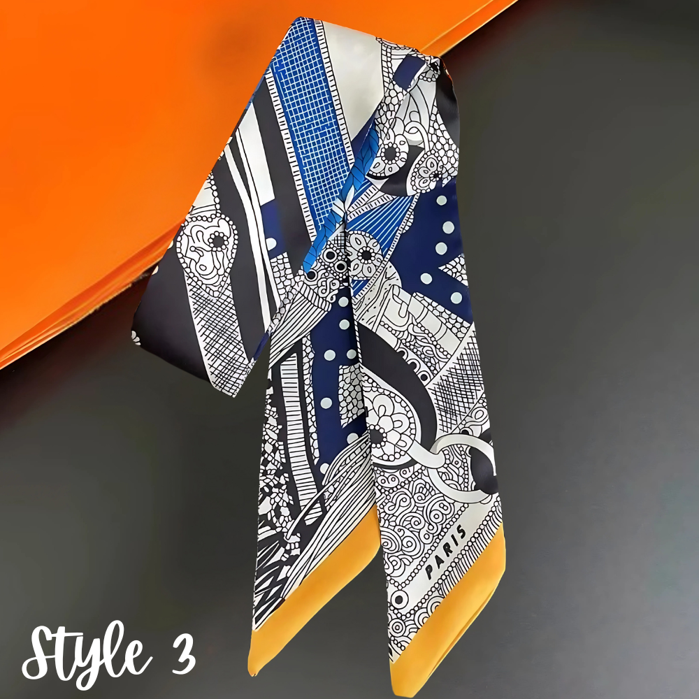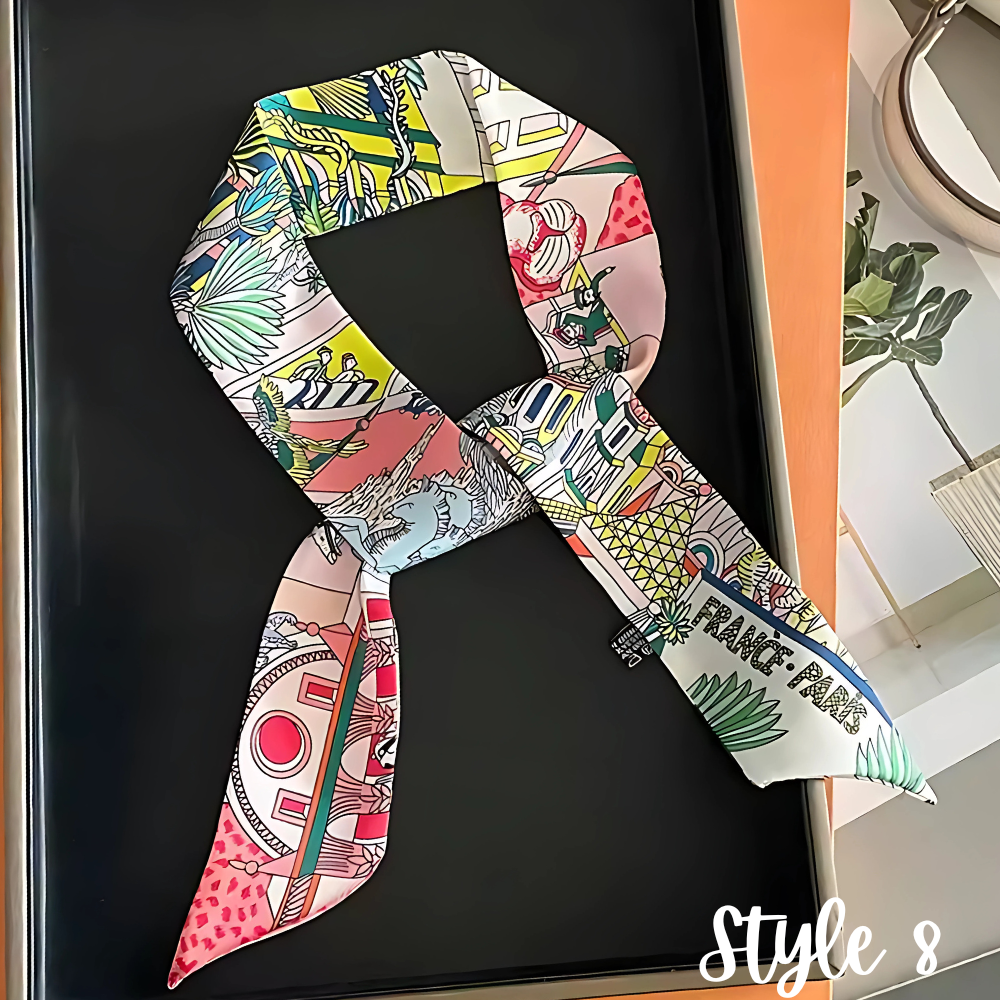 - colorful skinny scarves,- can be worn many ways: neck tie, bag charm, hat accent, bow, belt.- silky polyester material.- approx. 35" long, approx. 1.9" wide.